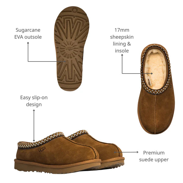 Lightweight platform? UGG braid detail? Endless wearability? Check, check, check! Our Tazz II keeps the ease and comfort you love about our Tazz. The upper is made with smooth suede lined with plush sheepskin and the sugarcane EVA outsole has an enhanced rocker shape for effortless movement.